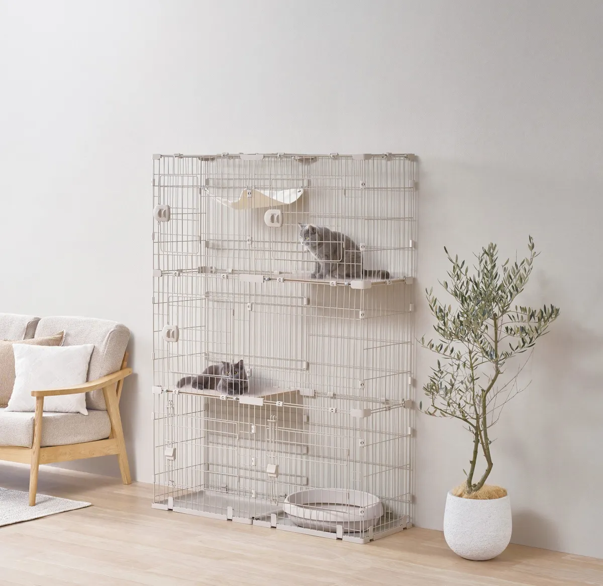 本商品は、幅1列のスリムタイプ、2列のワイドタイプ、3列のEXワイドタイプの3種類を展開。各アイテムは、高さを調整することができるため、多頭飼いをしている家庭でも対応できる設計になっています。コンパクトでありながら、猫の自然な運動を妨げない設計がなされており、快適な住環境を提供します。