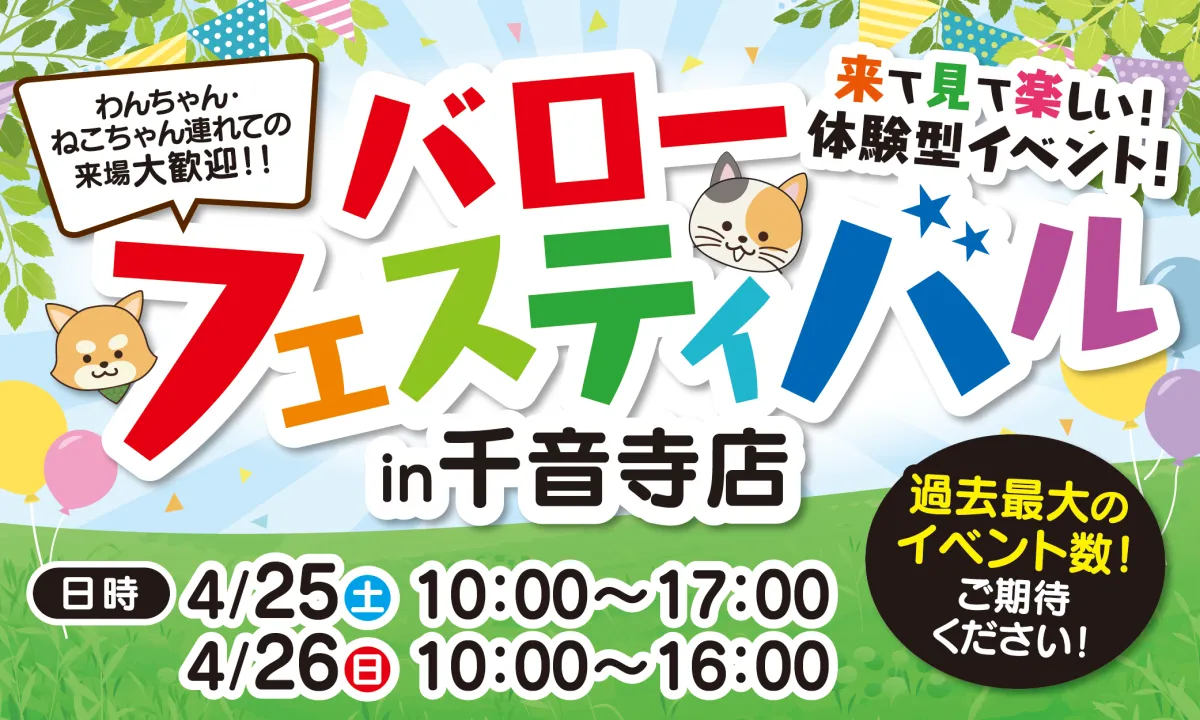 2026年の春、名古屋市中川区のホームセンターバロー千音寺店で、体験型イベント「バローフェスティバル in 千音寺店」が開催されます。開催日は4月25日(土)と26日(日)の2日間で、数多くのアクティビティが用意されており、家族連れや友人同士、ペット愛好家まで、幅広い世代のお客様に楽しんでいただける内容となっております。