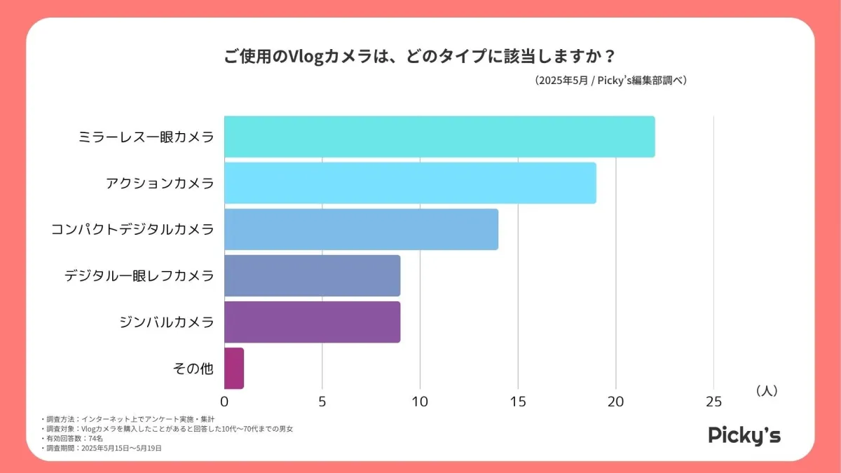 この調査は、2025年5月15日から19日までの期間にインターネット上で実施され、全国の10代から70代の男女74名が対象となりました。アンケート結果では、Vlogカメラの購入価格や用途、さらには後悔ポイントに至るまで、詳細なデータが得られました。