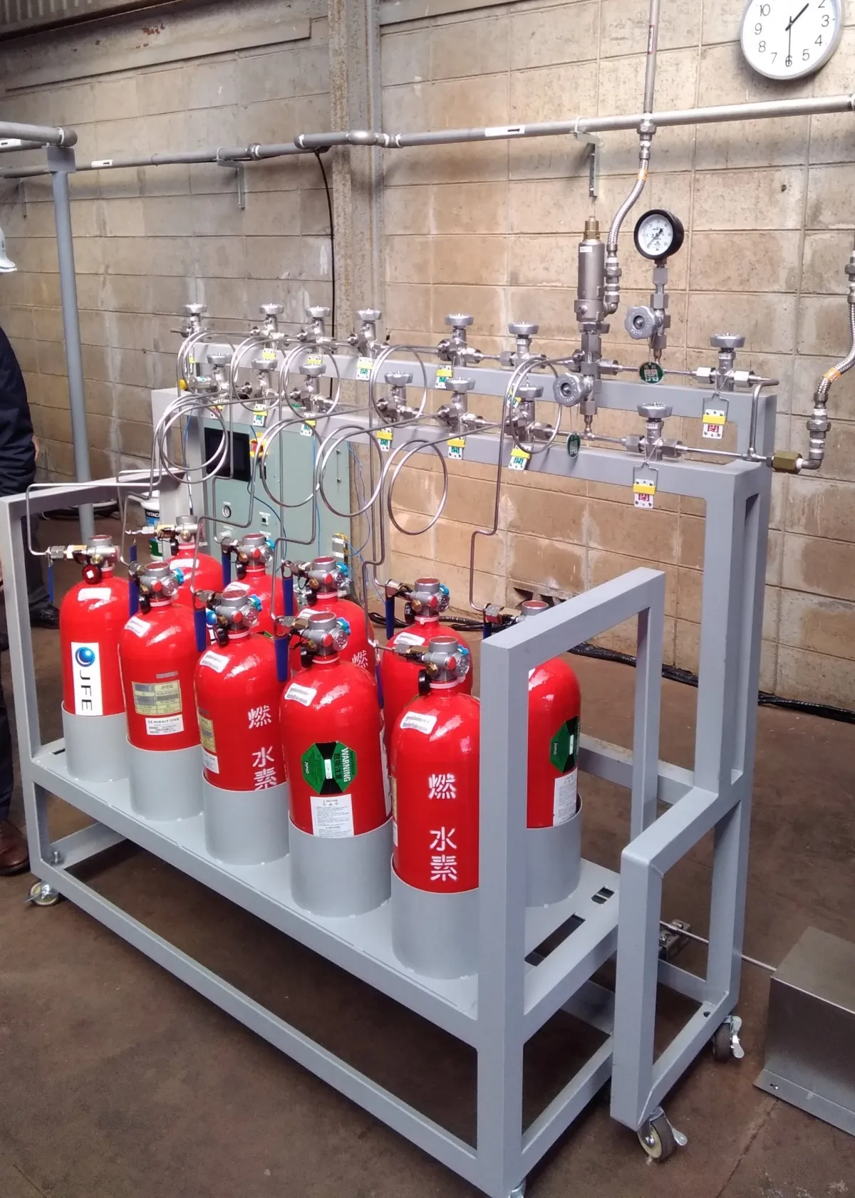 新たに開発された水素充填システムは、6.8リットルの小型高圧水素容器を3285をも充填可能です。年間生産能力は7200本にのぼり、1.1リットル、2.8リットルの容器にも対応しています。この技術により、水素マイクロモビリティだけでなく、工事現場や災害時の緊急電源としての活用が期待されています。