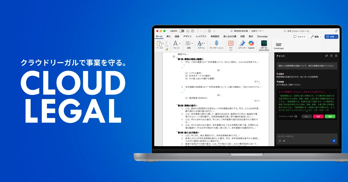 「CloudLegal AIエディター」は、弁護士が監修したリーガルAIを基に設計されており、ユーザーは慣れ親しんだMicrosoft Wordの画面内で直接契約書の条文チェックや修正提案を受けることができます。この画期的な機能のおかげで、契約書レビューにかかる時間を平均で3分の1に短縮することが可能になりました。