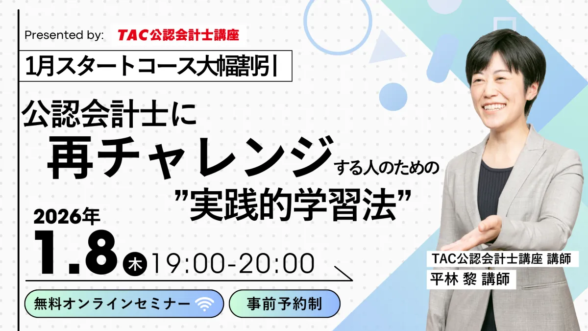 TAC株式会社が2026年1月8日(木)19:00から、再挑戦希望者を対象とした無料オンラインセミナーを開催します。本セミナーのテーマは「公認会計士に再チャレンジする人のための実践的学習法」であり、過去に学習を中断した受験者がどのようにして再度合格を目指せるかを具体的に解説します。