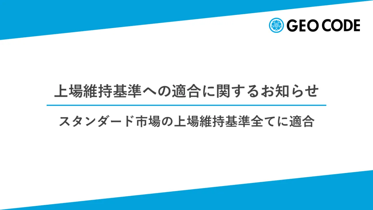 この適合状況は、東京証券取引所が株券の分布状況を考慮して算出を行った結果であり、上場企業としての信頼性が高まったことになります。今後もジオコードは、継続的な事業拡大を視野に入れ、さらなる企業価値の向上を目指していく方針です。