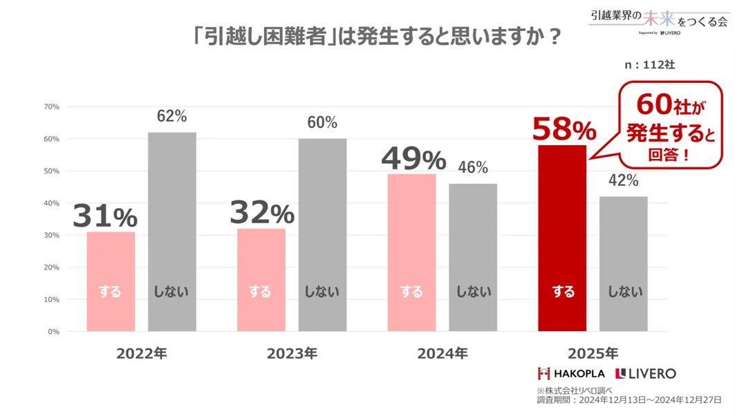 興味深いことに、調査では引越しの需要が増加傾向にあることも浮き彫りになりました。例年よりも申込み件数が増加する割合が47%に達し、これは過去4年間で最大の数字です。しかし、対応できる件数が減っていることから、「引越し困難者」が発生する可能性が高まっています。調査対象の58%の引越会社が、引越し困難者の出現を予測しているのです。