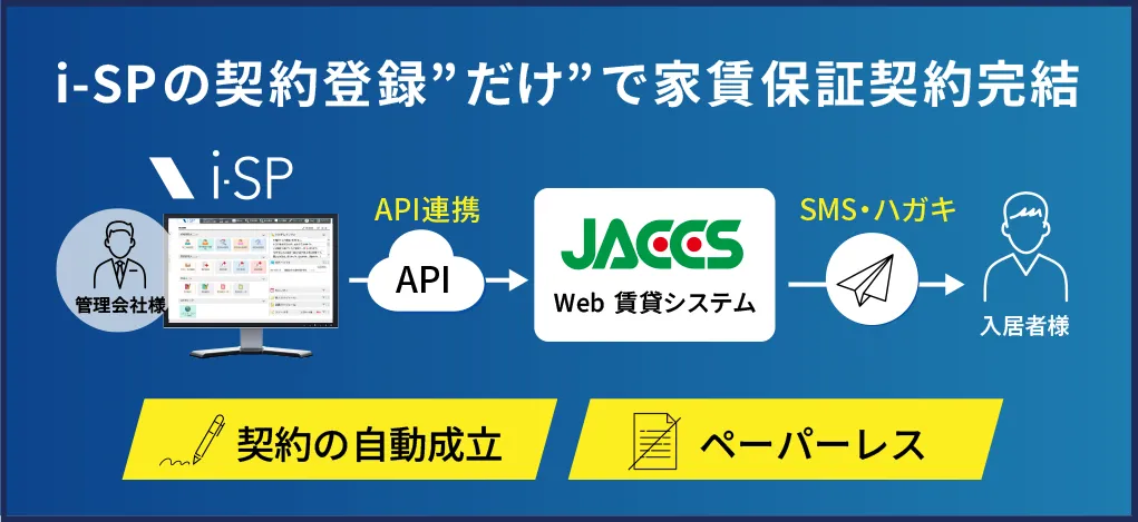 従来、賃貸住宅管理会社は「i-SP」と「JACCS‐Web 賃貸システム」に分かれて顧客データを登録しなければなりませんでした。この新システムの導入により、賃貸住宅管理会社は「i-SP」に顧客データを登録するだけで、保証契約や審査がワンストップで完了します。これにより、データの二重登録作業が不要となり、大幅な業務効率化が期待されます。