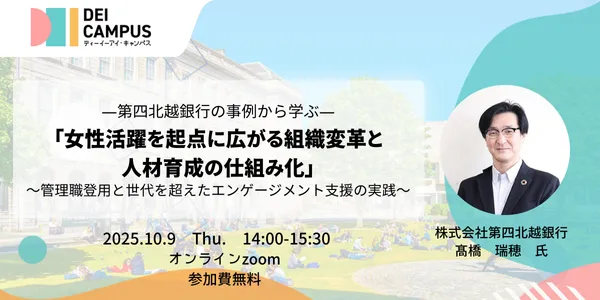 セミナーでは、第四北越銀行の人事部門から高橋瑞穂氏が講演し、女性活躍推進に関する重要な施策と実践例を多角的に紹介します。株式会社wiwiwは「DEI Campus」というプラットフォームを通じて、企業や団体のダイバーシティ、エクイティ&インクルージョン(DEI)の推進を支援しているリーディングカンパニーです。