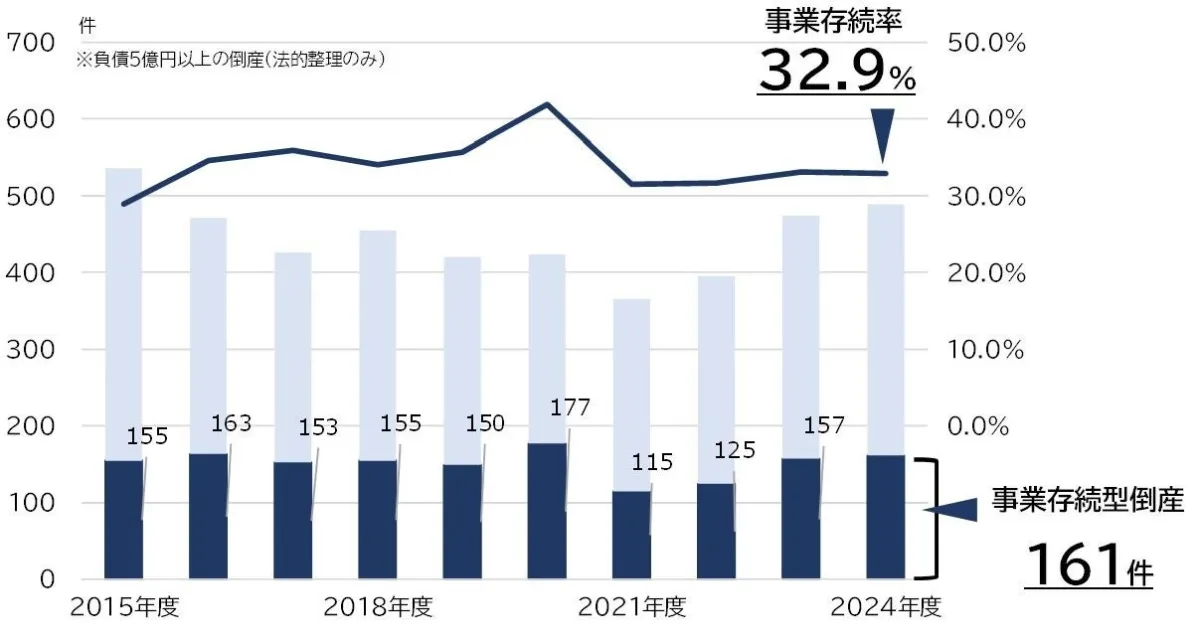 2024年度の事業存続型倒産の件数が161件で、前年より4件増加したことは一見驚くべき数字ですが、全体の倒産件数に占める割合(事業存続率)は32.9%にとどまります。これは、昨年度からわずか0.2ポイントの減少であり、依然として約3社に1社が事業を継続する状況にあると言えます。
