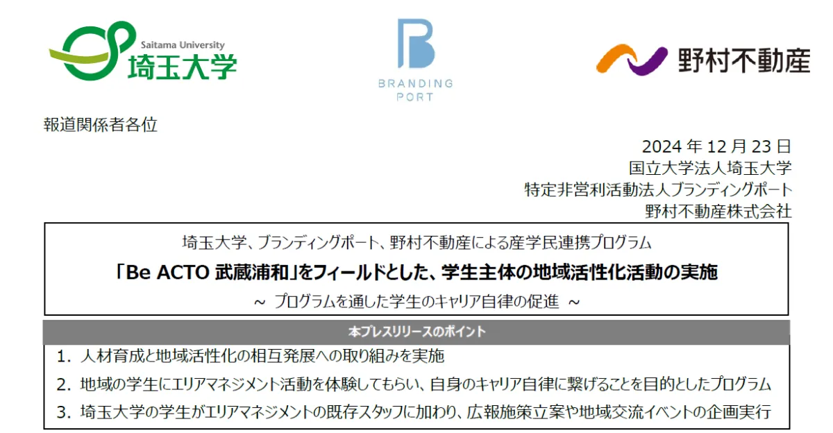 埼玉県さいたま市に位置する国立大学法人埼玉大学、特定非営利活動法人ブランディングポート、そして野村不動産株式会社が共同で実施している地域活性化プログラム「Be ACTO 武蔵浦和」が注目を集めています。このプログラムは2024年8月から開始され、埼玉大学の学生を中心とした地域住民のシビックプライド醸成を目指しており、参加学生たちは地域への愛着や誇りを育む活動に取り組んでいます。