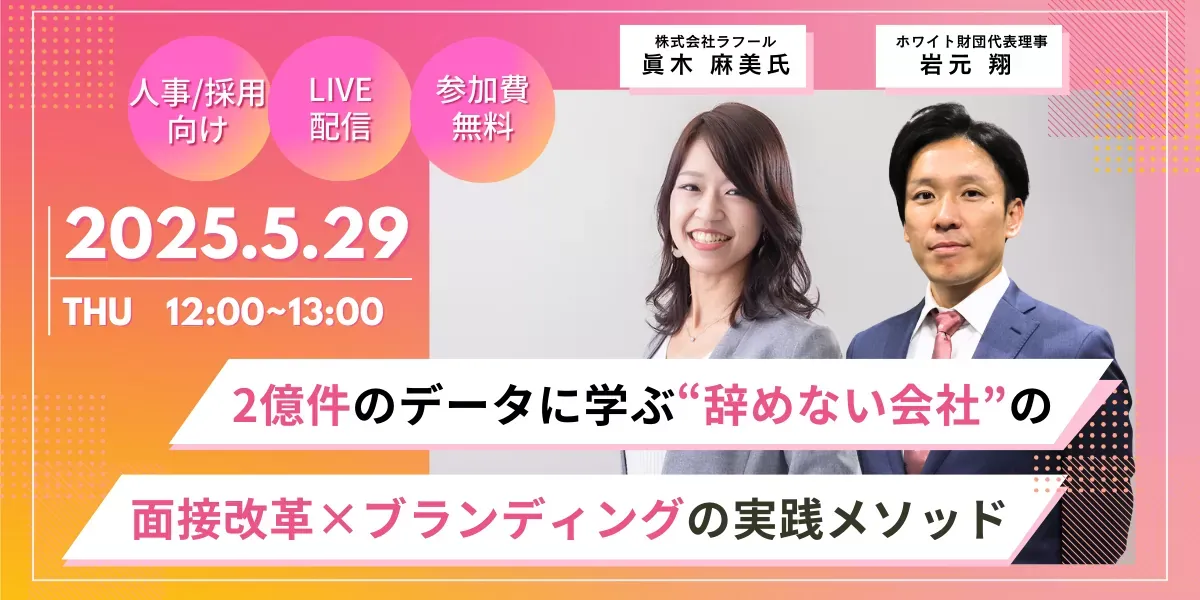 株式会社ラフールは、人的資本経営の支援を行う企業で、数多くの企業に向けてウェルビーイングを促進する解決策を提供しています。特に、同社の企業文化は「辞めない人材」を見抜くことに焦点を当てています。この度、ラフールは一般財団法人日本次世代企業普及機構(通称ホワイト財団)と共に、2025年5月29日(木)にオンラインセミナーを開催します。このセミナーでは、2億件を超えるデータを基にした面接改革やブランディングの実践方法が紹介されます。