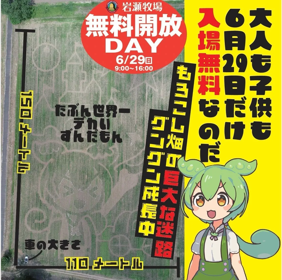 「岩瀬牧場 無料開放DAY」では、毎年夏に行われる「とうもろこし巨大迷路」が注目の的です。今年は、YouTubeやニコニコ動画などでファンを多く持つキャラクター「東北ずんだもん」とのコラボにより、地上絵を作成する新しい試みが行われます。来場者は成長途中の迷路を楽しむことができるだけでなく、まきばのマルシェでは40以上の店舗が集結し、グルメや雑貨が販売されます。