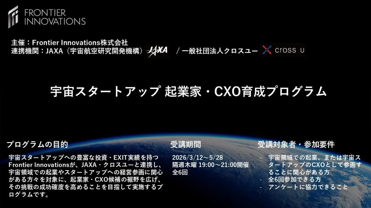 Frontier Innovations株式会社は、国立研究開発法人宇宙航空研究開発機構(JAXA)、一般社団法人クロスユーと連携し、宇宙スタートアップ向けの起業家・CXO育成プログラムを開講します。このプログラムは、宇宙分野への興味を持つ方々を対象にし、起業やスタートアップの経営に携わる能力を高めるための場を提供します。