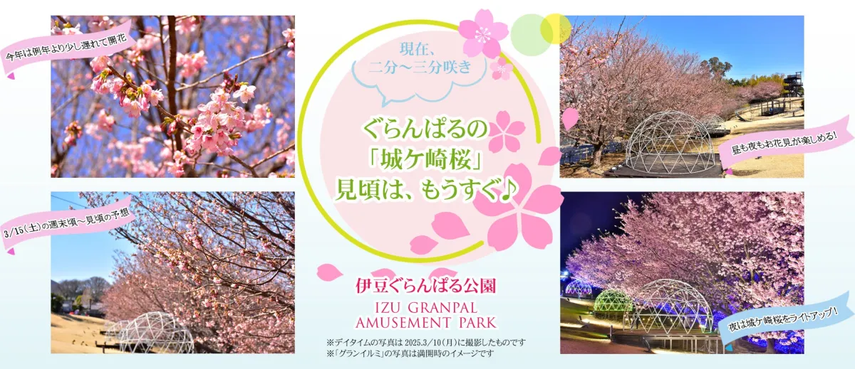 静岡県伊東市にある伊豆ぐらんぱる公園。ここでは、地元で親しまれる早咲きの「城ケ崎桜」が、今まさに見頃を迎えようとしています。今年の開花は例年より少し遅れていますが、週末から来週にかけて満開の桜が楽しめる予想です。