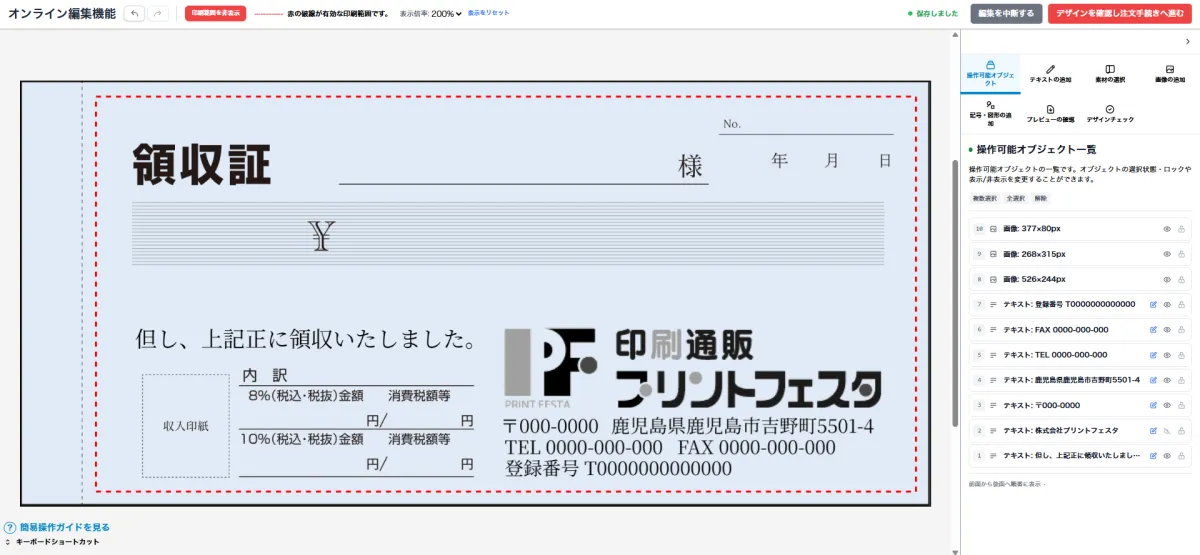 プリントフェスタの「カンタン領収書印刷コーナー」は、ブラウザ上で直感的に操作できるデザインツールを提供しています。必要なのはマウスを使った基本的な操作のみ。文字を配置したり、画像を挿入したりすることが驚くほど簡単にできます。そして、最近の大幅リニューアルによって、より使いやすさと機能性が向上しました。プロ向けのデザインソフトに匹敵する機能を搭載していますが、初心者でも迷わずに使える操作性が特徴です。