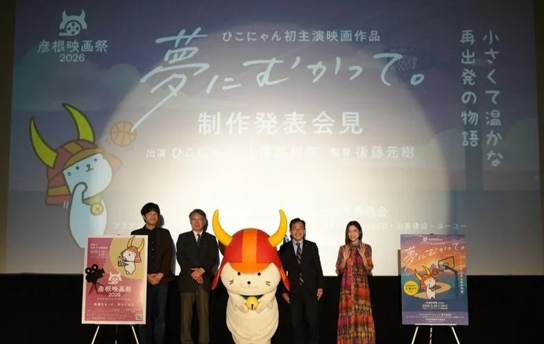 イベントは映画『青い山脈』の上映で幕を閉じない。上映後には、彦根のご当地キャラクター・ひこにゃんの初主演映画『夢にむかって。』の制作発表が行われました。ひこにゃんが主演するこの作品は、夢を追う人たちの物語で、観客の心に小さな灯りをともします。