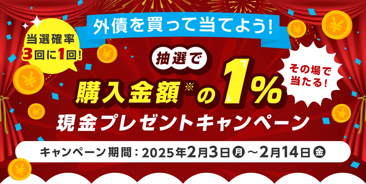 SMBC日興証券では、2025年2月3日(月)から2月14日(金)の期間、既発の外貨建て債券を購入した方を対象にしたお得なキャンペーンを実施します。この期間中に外債を購入すると、抽選くじがメールで届き、購入金額の1%が現金でプレゼントされるチャンスがあります。