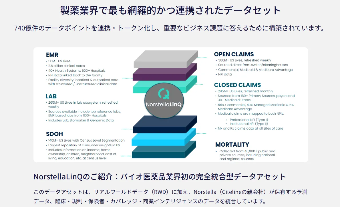 Citeline/Evaluateは、医薬品開発を20年以上支援してきたリーディングカンパニーです。米国人口の約90%をカバーする3億件以上のリアルワールドデータを有し、製薬業界におけるデータ提供の先駆者として知られています。特に「NorstellaLinQ」というデータセットは、医薬品開発における重要な資源となっています。