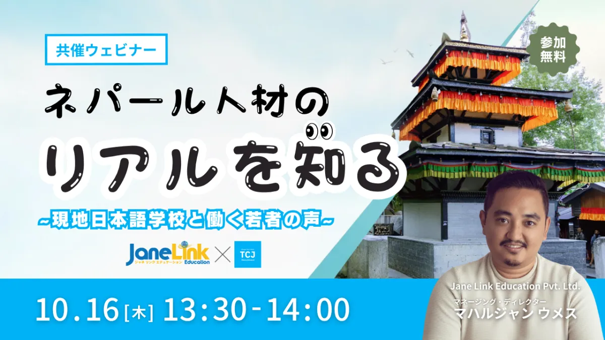 企業における国際人材の必要性が高まる今日、ネパールの若者が日本でのチャンスを求める姿勢が注目を集めています。これに伴い、株式会社TCJグローバルは、「Jane Link Education Pvt. Ltd.」との共催により、2025年10月16日(木)に『ネパール人材のリアルを知る!現地日本語学校と働く若者の声』というテーマの無料ウェビナーを開催いたします。このイベントでは、ネパールにおける日本語教育の現場や、そこで学ぶ若者たちの実情を詳しくお届けします。