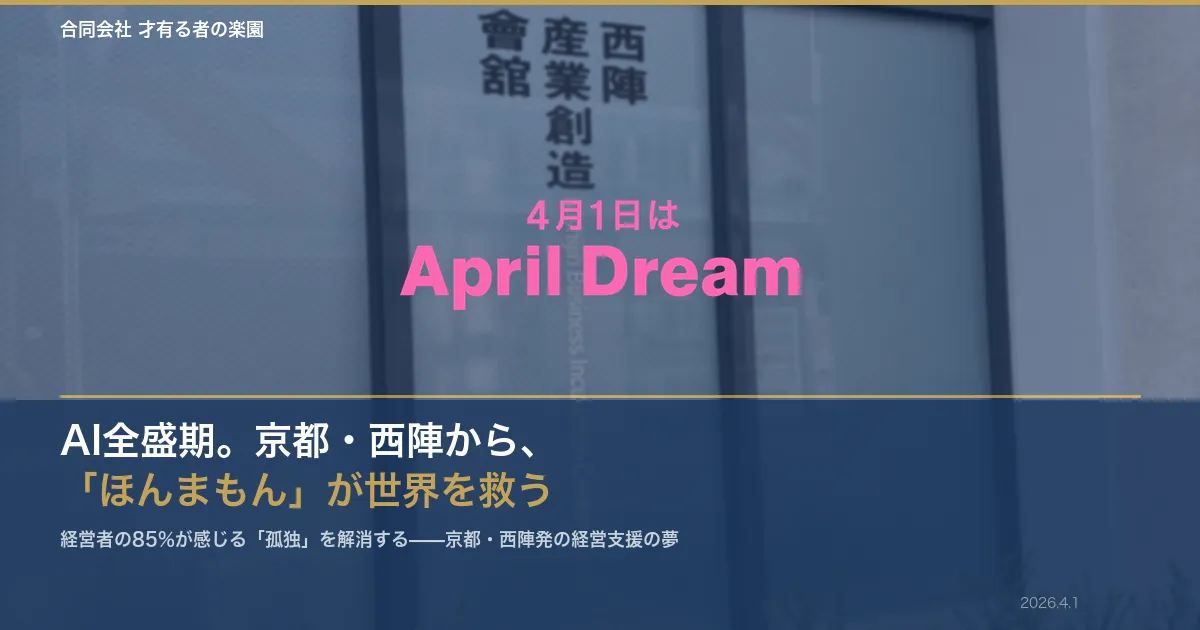 日本の伝統文化が色濃く残る京都・西陣に、新たなビジョンを持った企業が登場しました。合同会社「才有る者の楽園」は、国の重要文化財に指定されている「西陣産業創造會舘」を拠点に、中小企業の経営支援を行います。この企業は、AIを駆使して中小企業の経営者の孤独感をサポートし、「ほんまもん」が持つ力を活かした経営哲学の構築を目指しています。