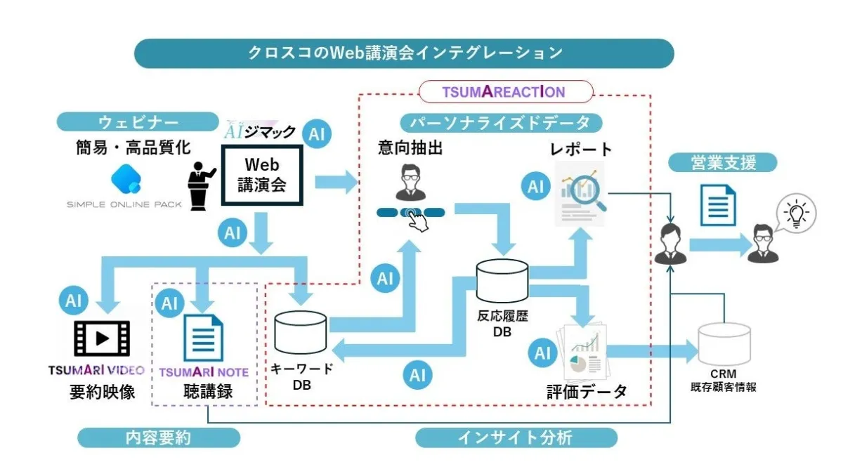 株式会社Jストリームの子会社であるクロスコ株式会社は、Web講演会(ウェビナー)の新たな形を提供する「AX(AI Transformation)」に取り組んでいます。新たに発表されたサービス「TSUMAREACTION(ツマリアクション)」と「TSUMARI NOTE(ツマリノート)」は、AIを用いることで、講演の質を大幅に向上させることを目指しています。