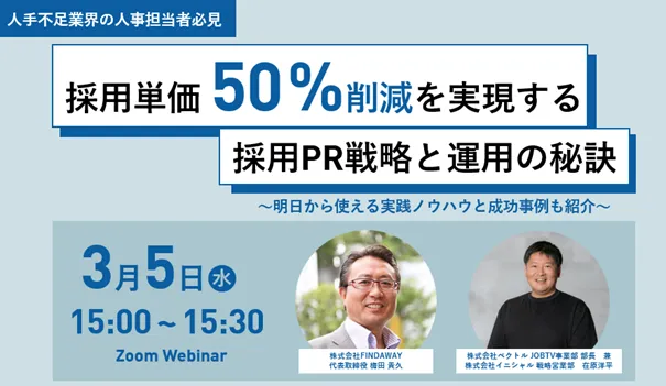 セミナーでは、株式会社FINDAWAYの代表取締役である梅田貴久氏と、株式会社ベクトルのJOBTV事業部部長兼株式会社イニシャル戦略営業部の在原洋平氏が登壇します。お二人とも人材採用の専門家であり、それぞれの経験を基にした実践的なノウハウを提供してくれます。