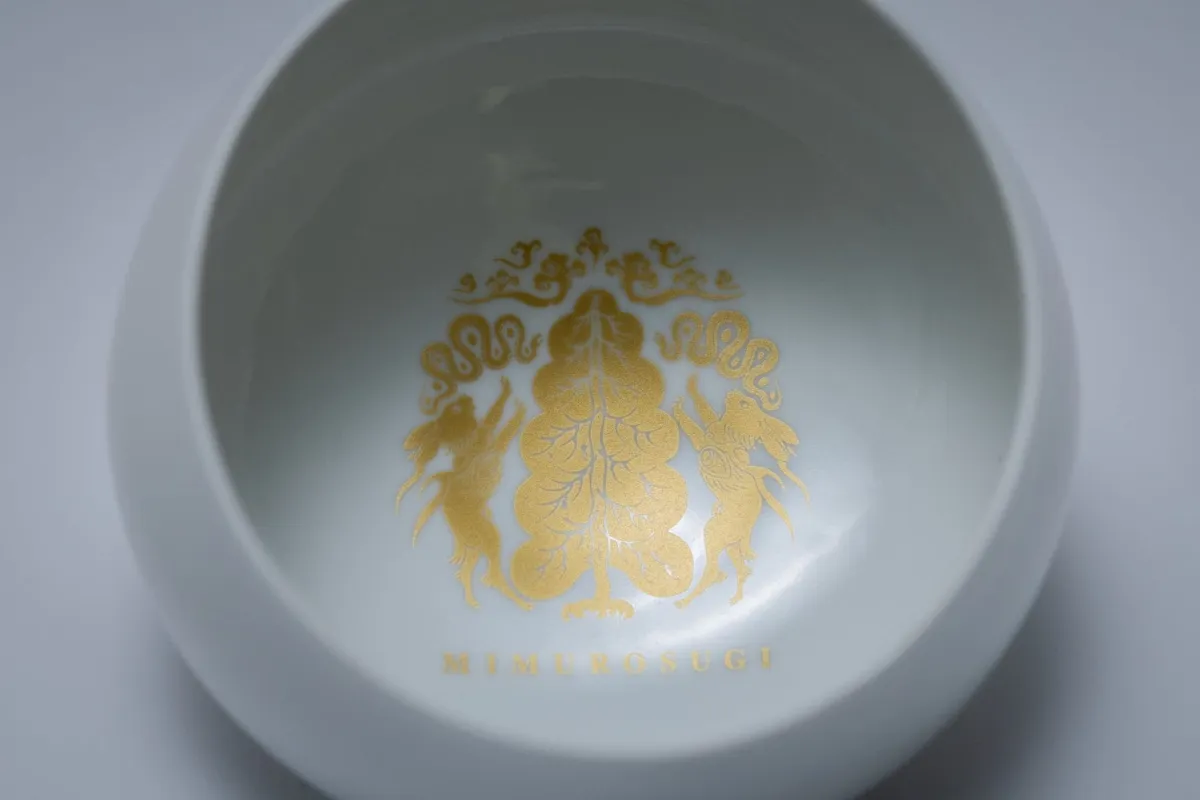 酒器の底には、みむろ杉の刻印が施されており、そのデザインテーマは「神仏習合」となっています。このテーマは、大神神社や三輪信仰と深く結びついたもので、神聖さと静謐さを象徴する形で表現されています。ロゴには大神神社に縁のある「白蛇」、「兎」、そして御神花である「ササユリ」が取り入れられています。