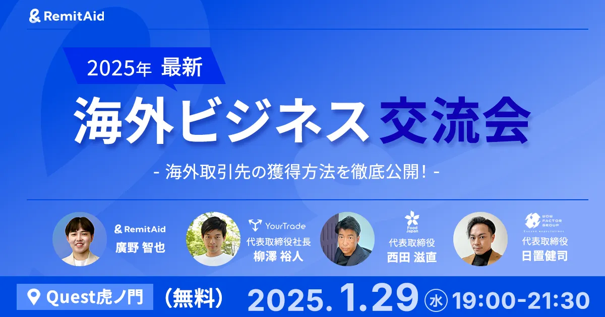 2025年1月29日(水)、東京都渋谷区のQuest虎ノ門で、株式会社RemitAidによる無料の「2025年最新海外ビジネス交流会」が開催されます。このイベントでは、海外ビジネスに関心のある企業や個人を対象に、海外取引先を取得するための情報と機会を提供します。イベントの目的は、「世界に挑む日本を支える」というビジョンのもと、海外企業とのスムーズな取引を促進することです。