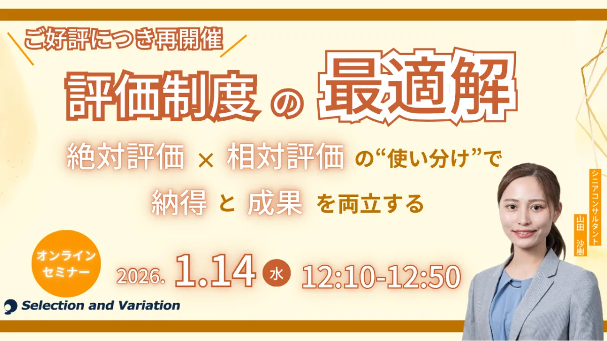 組織や人事の専門企業、セレクションアンドバリエーション株式会社が、2026年1月14日(水)にオンラインセミナー「評価制度の最適解」を開催します。このセミナーでは、絶対評価と相対評価の使い分けをテーマに、納得のいく評価制度の構築方法について解説します。