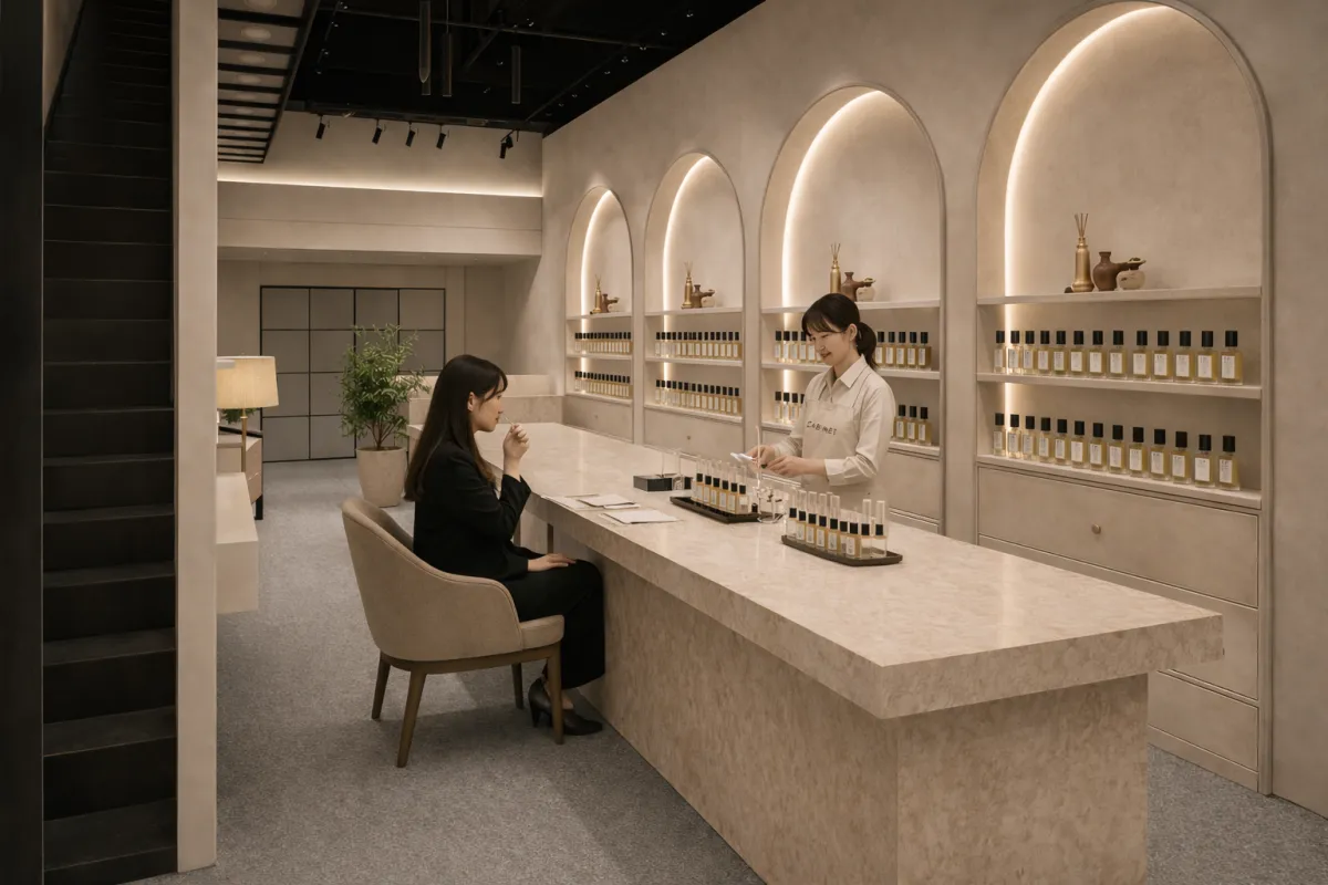 店舗の内装は、白とチャコールグレー、マットゴールドを基調にし、静かで知的なスペースを提供しています。訪れる人が安心して自分の感覚を預けられるように計算されたデザインです。アーチ状のカウンターの裏には無数の引き出しが施されており、これらは香りを作品として大切に扱う考えを映し出しています。また、大谷石を使った接客カウンターは、ブランドが持つ香りの履歴保管の姿勢を物語っています。
