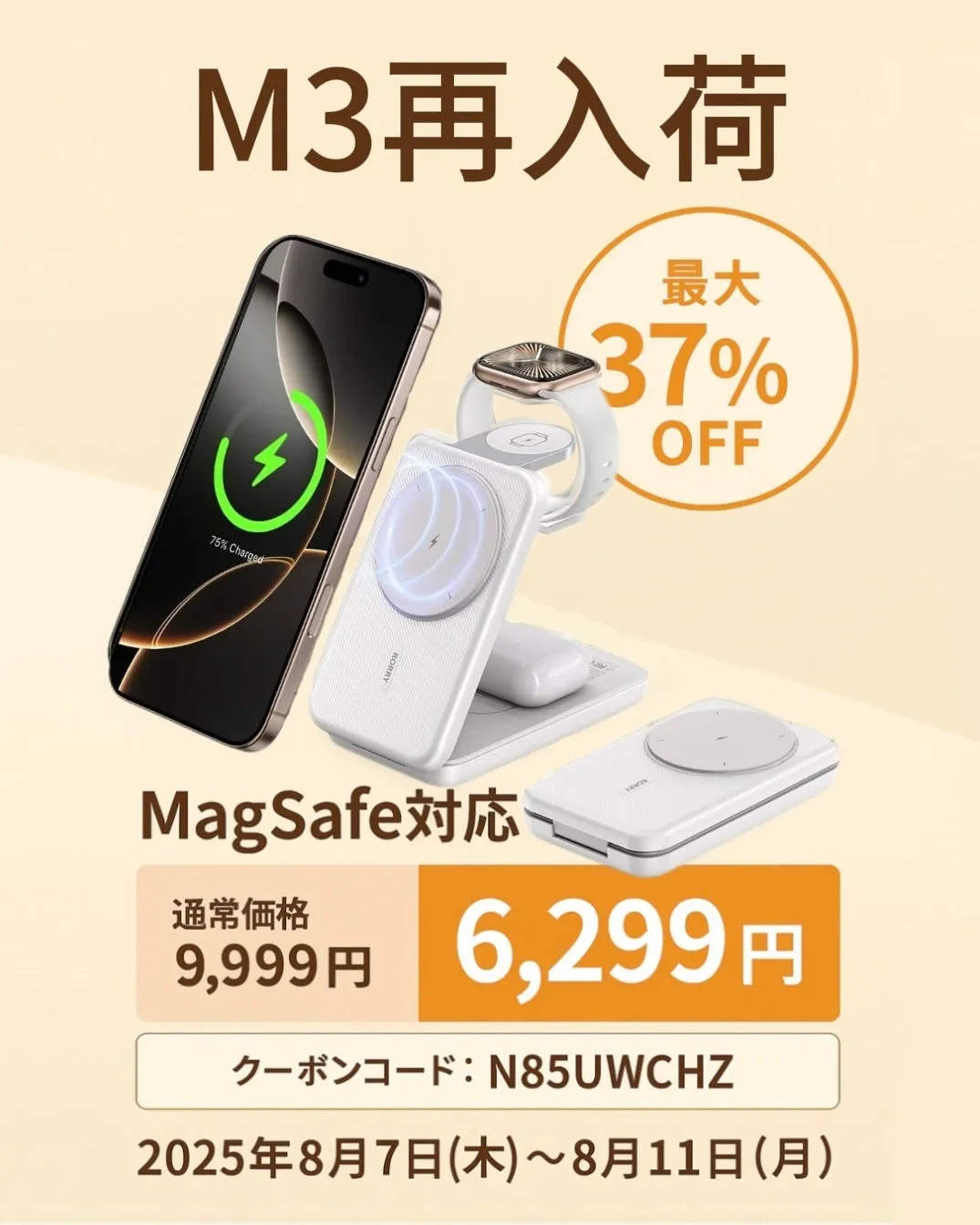 M3モバイルバッテリーの通常価格は9,999円ですが、セール期間中は6,999円で販売されます。また、クーポンコード「N85UWCHZ」を使用することで、さらにお得な6,299円(37% OFF)で購入可能です。このキャンペーンは2025年8月7日から8月11日までの期間限定です。