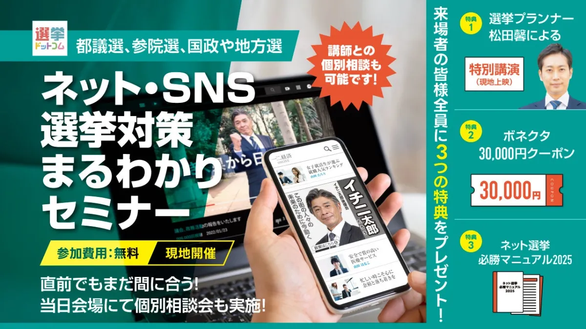 このように、ネットやSNSを活用した選挙活動の最前線を知ることができるこのセミナーは、特に次回の選挙を目指す候補者にとって非常に重要な学びの場となるでしょう。有権者との新たなつながりを求めている皆さん、ぜひご参加をお勧めします。セミナーへの参加申し込みは、公式サイトから簡単に行えます。興味がある方はお早めにお申し込みください。