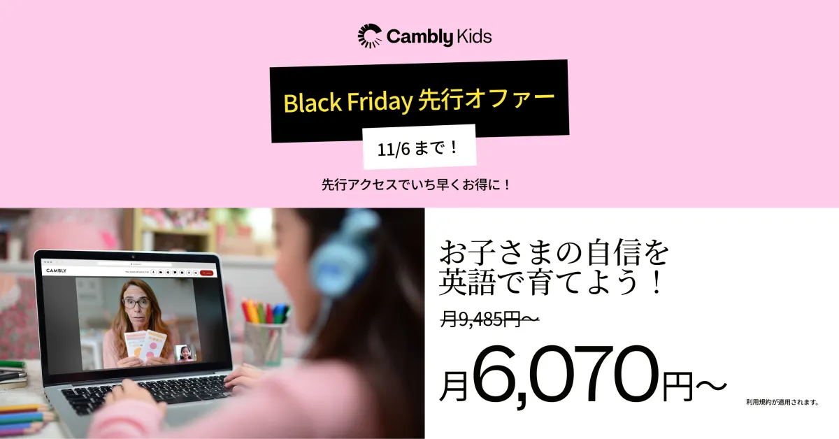 米国サンフランシスコに本社を置くCambly Inc.は、子ども向け英会話サービス「Cambly Kids」にて、特別なBlack Friday先行オファーを発表しました。このオファーは、日本の家庭向けに、ネイティブ講師によるマンツーマン英会話レッスンを史上最大の割引価格で利用できるチャンスです。