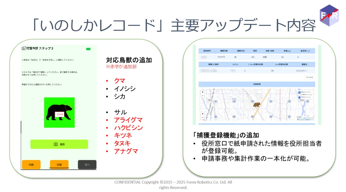 2025年10月21日、Forex Robotics株式会社は有害獣捕獲情報システム『いのしかレコード』の大型アップデートを実施しました。このシステムは、自治体が鳥獣被害対策を円滑に行うためのデジタルプラットフォームです。これにより、捕獲申請業務の効率化が図られ、特にクマや中型獣の捕獲申請に対応する機能が追加されました。