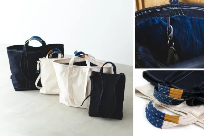 昨今のトレンドとして注目される「BORO」の発想を取り入れ、意図的に伊予かすりで補修したように見せるデザインが施されています。特にバッグのハンドル部分には伝統的な絣の織柄が使われ、使い込むことでその美しさが引き立つようになっています。これにより、過去の「野良着」としての役割も感じていただけるでしょう。