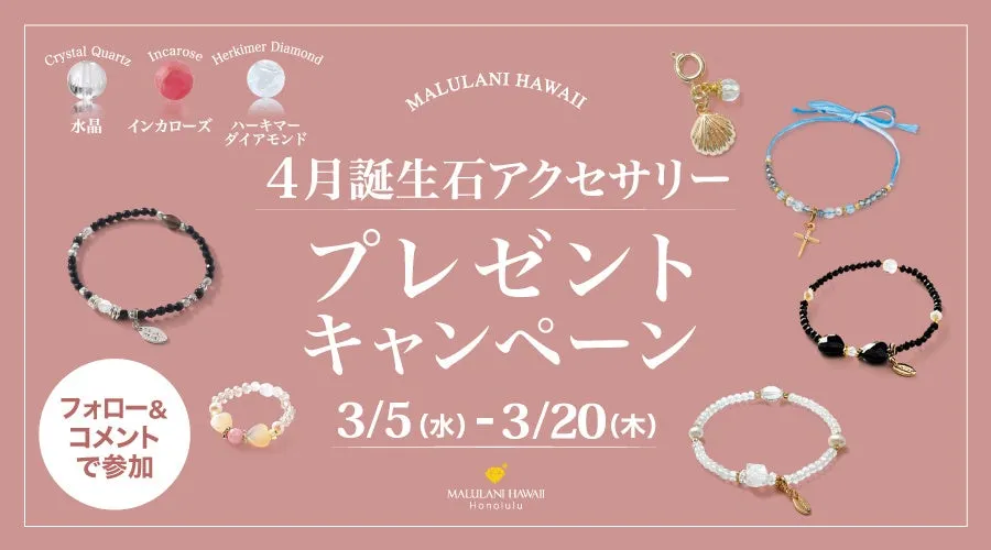ハワイの天然石アクセサリーブランド「マルラニハワイ」が、4月の誕生石である「水晶」「ハーキマーダイヤモンド」「インカローズ」を使用した特別なアクセサリーを抽選でプレゼントするキャンペーンを発表しました。この機会に、素敵なパワーストーンアクセサリーを手に入れましょう!