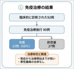 155例の患者が報告され、そのうち92例の詳細なデータが分析されました。その結果、免疫治療を受けた患者の約66%に症状の改善がみられ、発症から治療までの期間が短いほど効果が得やすいことが明らかになりました。また、調査対象者の中には悪性腫瘍を合併している例もあり、これが診断と治療に影響を与える要因と考えられています。