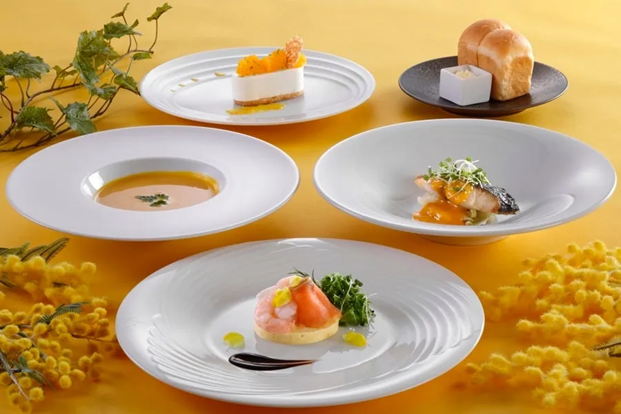 このレストランでは、「ミモザコース」という特別メニューを提供します。前菜には、海の幸を使用したムースがミモザ風にアレンジされ、メインには「黄身味噌ソースを使ったサワラのポワレ」と「ハニーバターソースで仕上げたチキンのポワレ」からお好きな一品を選べます。デザートには、はちみつを使ったパルフェが楽しめます。