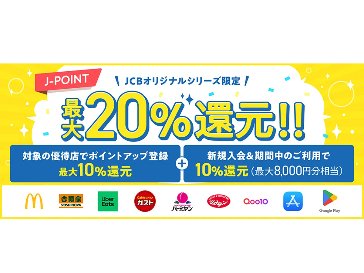 2026年1月13日から3月31日の期間中、新規入会者を対象に「対象優待店の利用で最大20%還元」というキャンペーンが行われます。具体的には、事前にポイントアップ登録を行い、指定された優待店での使用に対して、ご利用金額のうち最大10%が「J-POINT」として還元されます。