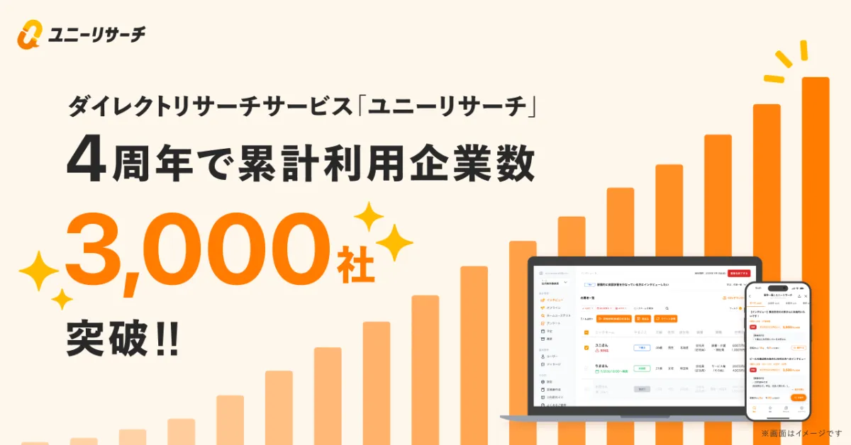 株式会社プロダクトフォースが提供するダイレクトリサーチサービス、ユニーリサーチが4周年を迎え、これまでの利用企業数が3,000社を突破したことを発表しました。この大きな節目を迎えたユニーリサーチの成長過程や今後の目標について詳しくご紹介します。