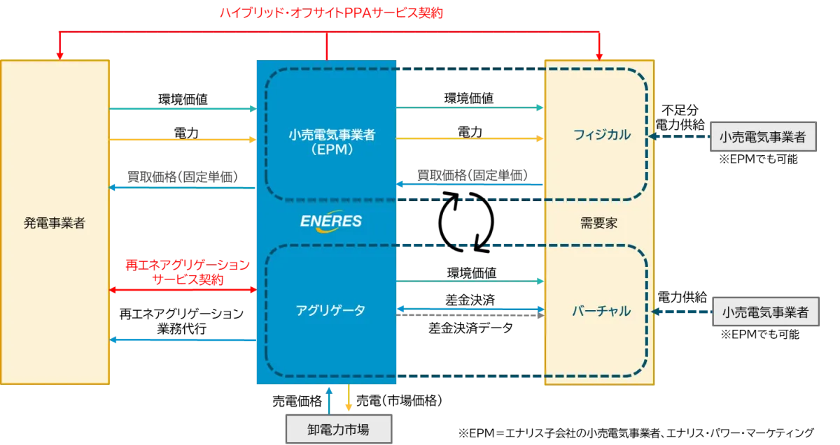 エナリスの「ハイブリッド・オフサイトPPA」では、企業が契約期間中にフィジカルPPAとバーチャルPPAのどちらかを選べるという柔軟性が魅力です。これにより、持続可能なエネルギー調達が一層容易になり、特にRE100目指す企業にとって大きな助けとなるでしょう。