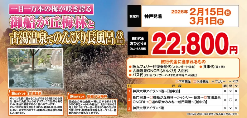 阪九フェリーが贈る梅の名所と温泉を巡る3日間の旅