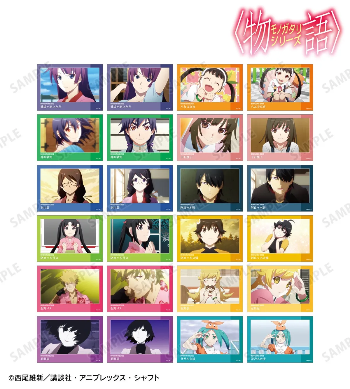 全24種のデザインがあり、戦場ヶ原ひたぎや阿良々木暦など人気キャラクターの印象的なシーンを切り取ったブロマイドとなっている。コレクションや部屋のインテリアとしても楽しめるアイテムだ。予約特典として「忍野忍 場面写ブロマイド AMNIBUS限定特典」が付属する。