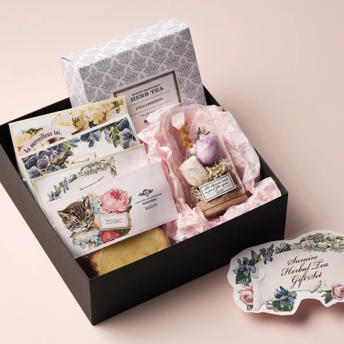 - 含まれるアイテム: ハーブティー6包、プリザーブドフラワー、パウンドケーキ4種。