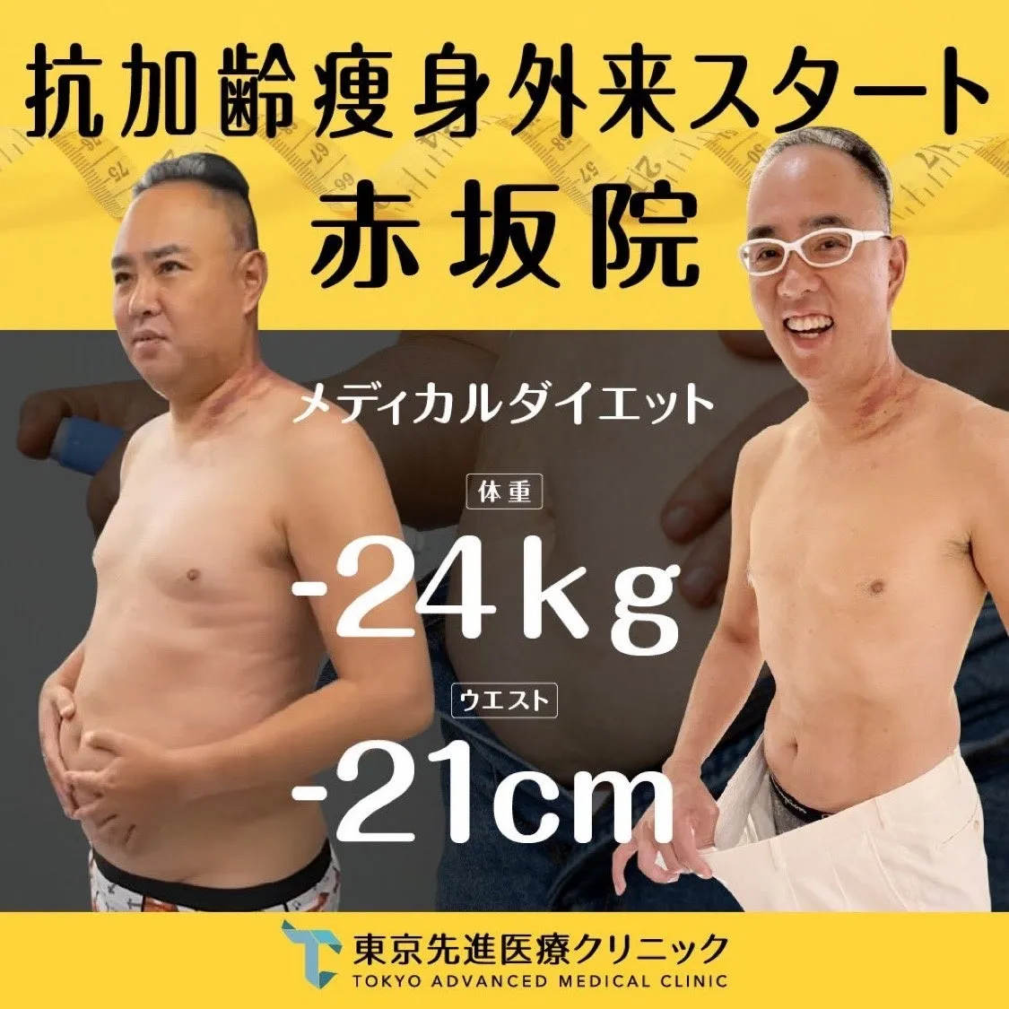 東京先進医療クリニック赤坂院(東京都港区赤坂)では、2025年夏より「抗加齢痩身外来」を本格的にスタートしました。この新しいサービスでは、医師が直接自らをモデルにし、実際に24kgの減量に成功した麻生泰院長がその成果を示しています。彼のダイエットの経過は、院内でビフォーアフターのバナーとして紹介され、患者さまへ医療的なアプローチの効果をアピールします。