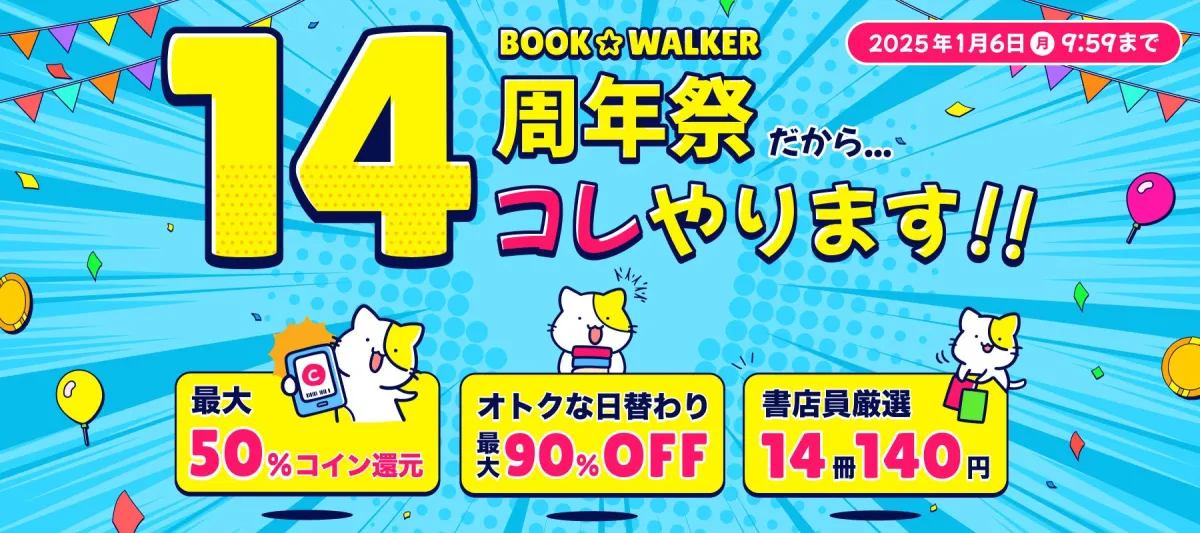 株式会社ブックウォーカーが運営する総合電子書籍ストア「BOOK☆WALKER」が、サービス開始14周年を祝して、特別なキャンペーン「BOOK☆WALKER 14周年祭」を2024年12月6日から2025年1月6日まで開催します。この期間中、多彩なお得な企画が用意されており、利用者にとって見逃せないチャンスとなっています。