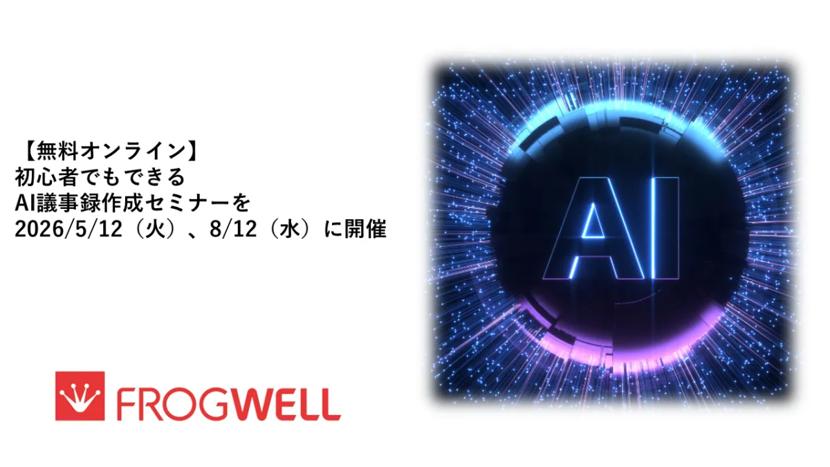 フロッグウェル株式会社は、AIを利用した議事録作成の無料オンラインセミナーを開催します。このセミナーでは、初心者でも簡単に議事録を作成できる方法を学ぶことができるチャンスです。2026年5月12日(火)と8月12日(水)の2回、各16:00から17:00まで実施されます。
