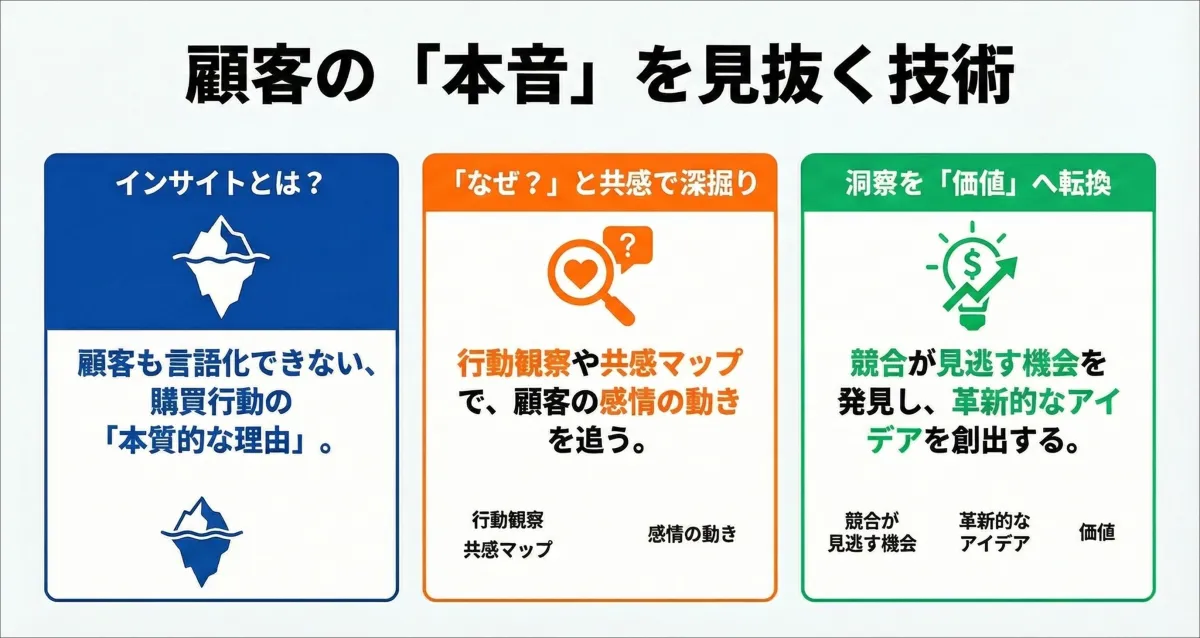 ニーズとインサイトの違いを明確化:顧客の本音を把握することで、表面的な欲求とその根底にある真の動機を理解します。