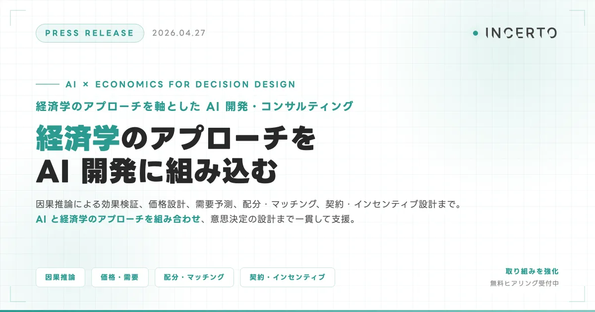 Incertoはこれまでにも文書処理の自動化や業務の効率化、AIエージェントの導入支援を通じて多くの業種・業務に対する実装支援を行ってきました。しかし、AI単体では難しい施策の因果効果の検証や情報の非対称性に由来する契約・インセンティブ設計などの問題が多く存在することが検証されてきました。これらのポイントに経済学のアプローチを取り入れることで、より質の高いソリューションを提供できると信じているのです。