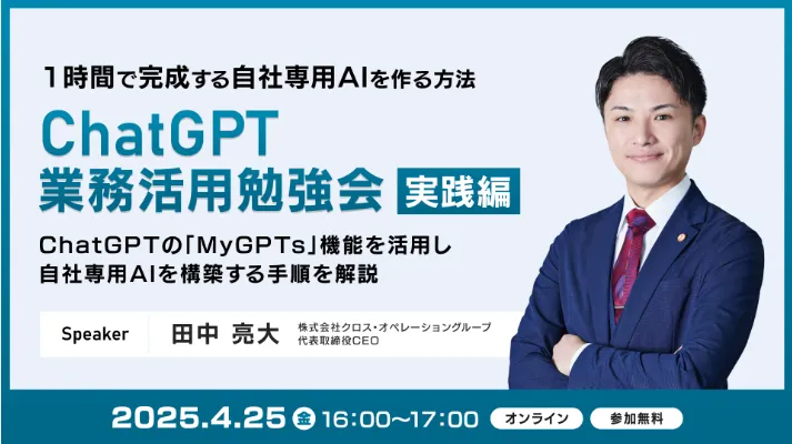 株式会社クロス・オペレーショングループ(以下、XOP)が主催する「ChatGPT業務活用勉強会【実践編】」が2025年4月25日(金)に開催されます。このオンラインセミナーは、特に経営者やビジネスリーダーの方々に向けて、生成AIを活用した業務改善の具体的な事例や手法を紹介することを目的としています。