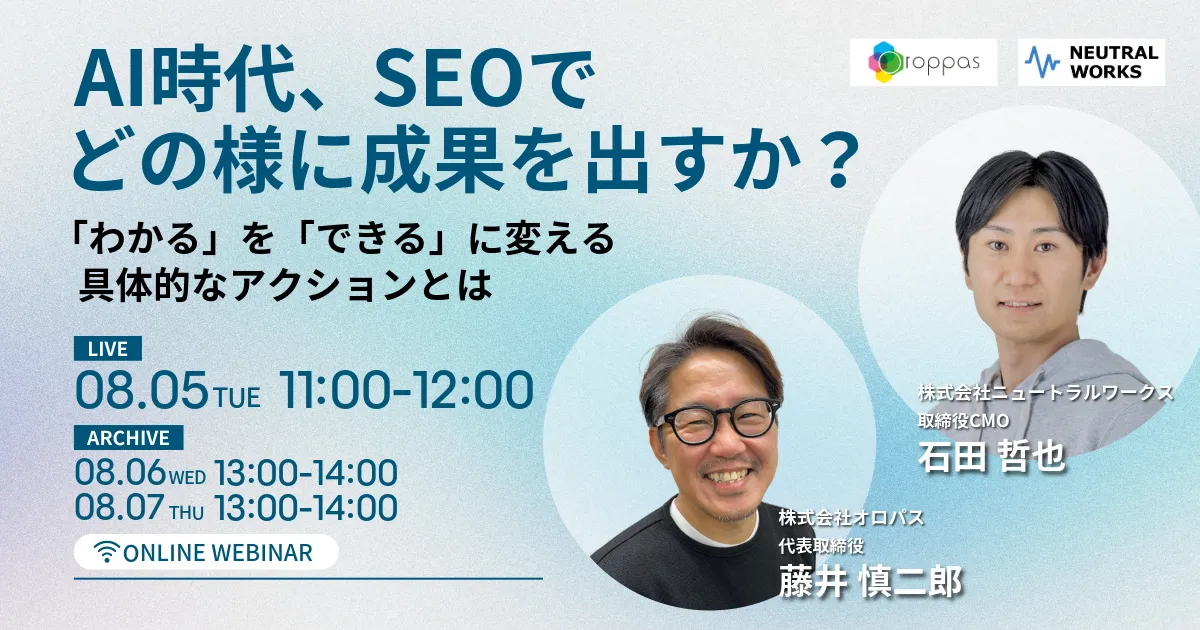 デジタルマーケティングが進化し続ける中で、SEO(検索エンジン最適化)もまた変化を遂げています。特に、AI技術の進展により、SEO戦略はこれまで以上に高度な知識と実践力が求められるようになりました。そんな中、株式会社ニュートラルワークスと株式会社オロパスが共催する無料ウェビナー「AI時代、SEOでどの様に成果を出すか?」が2025年8月5日に開催されます。本記事ではこのウェビナーの詳細と、参加の魅力をご紹介します。