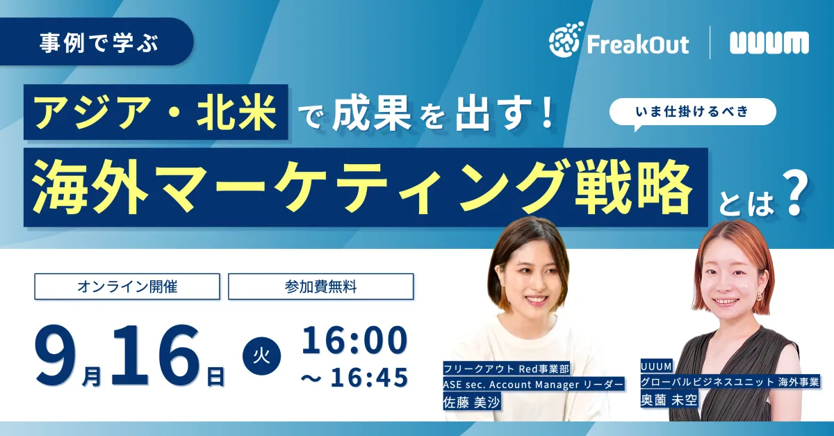 近年、インバウンド需要の増加に伴い、多くの企業が国内市場だけでなく、海外市場に目を向けるようになっています。日本のブランドや商品が世界に通用するためには、その国々の特性を考えたマーケティング戦略が不可欠です。そんな中、UUUM株式会社とフリークアウトが主催するウェビナー「【事例で学ぶ】アジア・北米で成果を出す!いま仕掛けるべき海外マーケティング戦略とは?」が2025年9月16日にオンラインで開催されます。このウェビナーでは、アジアや北米で実際に成功したマーケティング施策の具体例を通じて、効果的な戦略や施策の設計方法について学ぶことができます。